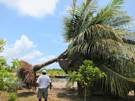 Since we are adding a third unit to The Maine Stay Cabanas, we have had to remove some trees to make room for the project. Not one to be wasteful, Miss Karen decided that these trees... four palms, needed to enhance our Kokomo lots. Peter, from Coco Plum, who is an absolute genius with a backhoe, and has five years experience successfully transplanting these tiny things, came over yesterday and made it all happen... with lots of help from Hector and Alejandro from The Maine Stay crew.